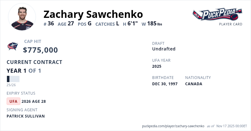 Zachary Sawchenko is signed to a 1 year, $775,000 contract with a cap hit of $775,000 per season, playing for the Columbus Blue Jackets. His contract expires at the end of the 2025-26 season, making Sawchenko an Unrestricted Free Agent.