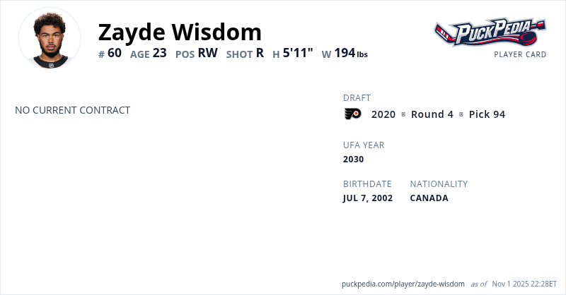 Zayde Wisdom is an Unrestricted Free Agent (No Qualifying Offer). His last contract was 3 years, $2,392,500 with a cap hit of $797,500 per season. It expired at the end of the 2024-25 season.