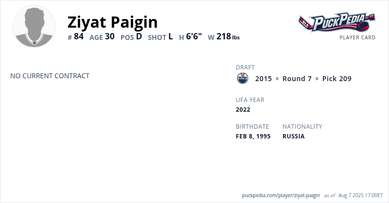 Ziyat Paigin is an Unrestricted Free Agent. His last contract was 2 years, $1,717,500 with a cap hit of $858,750 per season. It expired at the end of the 2018-19 season.