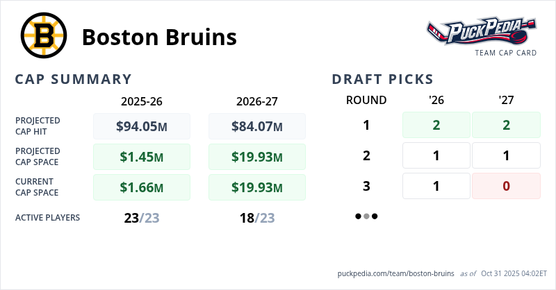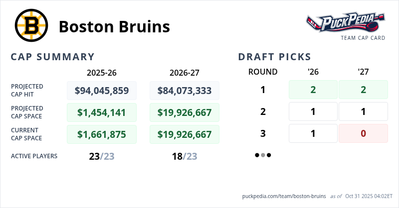 The Boston Bruins have $1,454,141 in projected cap space and a projected cap hit of $94,045,859. The team currently has an active roster of 23 players, with 46 players under contract.