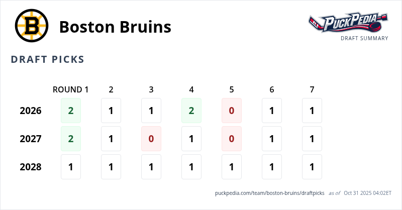 | 4 | 0.98 | Jun 28 2025 The Tampa Bay Lightning acquired a 2025 4th round pick (#108) from the Boston Bruins for a 2026 4th round pick | |