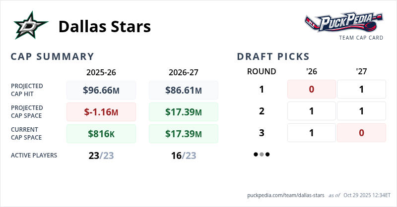 The Dallas Stars have $-1,164,812 in projected cap space and a projected cap hit of $96,664,812. The team currently has an active roster of 23 players, with 49 players under contract.