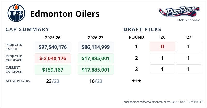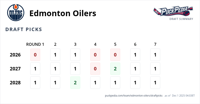 The Edmonton Oilers acquired a 2025 5th round pick (#131) from the Nashville Predators for a 2026 5th round pick