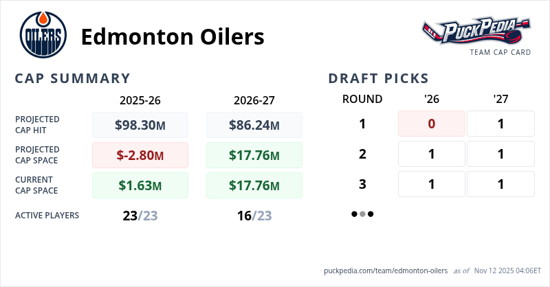 The Edmonton Oilers acquired a 2025 5th round pick (#131) from the Nashville Predators for a 2026 5th round pick