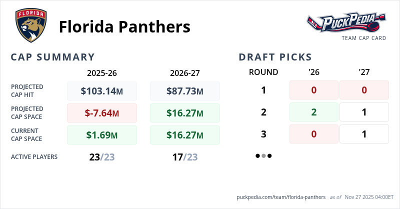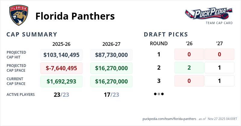 - The team's cap hit each day includes players who are on the NHL Roster as of 5pm Eastern.