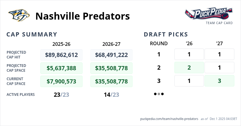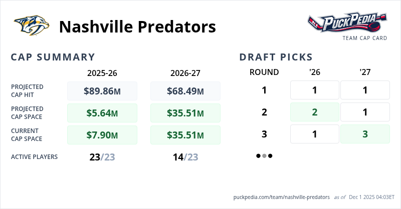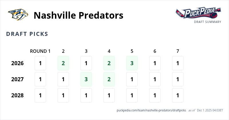The Edmonton Oilers acquired a 2025 5th round pick (#131) from the Nashville Predators for a 2026 5th round pick