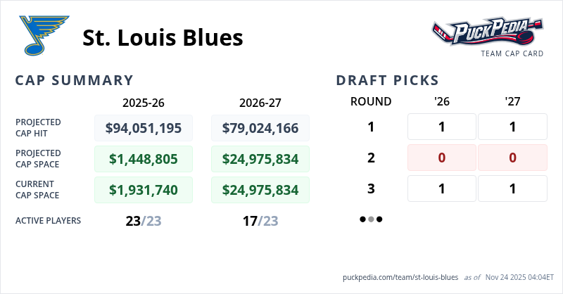 The St. Louis Blues acquired 2025 2nd Round Pick and 2026 5th Round Pick from the Pittsburgh Penguins for 2026 2nd Round Pick and 2025 3rd Round Pick