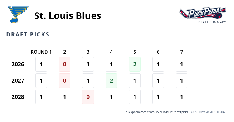 The St. Louis Blues acquired 2025 2nd Round Pick and 2026 5th Round Pick from the Pittsburgh Penguins for 2026 2nd Round Pick and 2025 3rd Round Pick