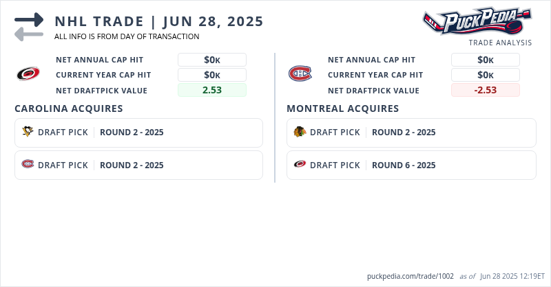 The Montreal Canadiens acquired a 2025 2nd round pick (#34) and a 2025 6th round pick (#189) from the Carolina Hurricanes for a 2025 2nd round pick (#41) and a 2025 2nd round pick (#49)