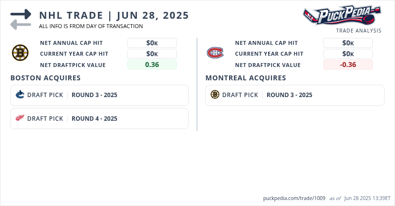 The Montreal Canadiens acquired a 2025 3rd round pick (#69) from the Boston Bruins for a 2025 3rd round pick (#79) and a 2025 4th round pick (#108)