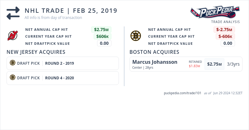 Boston Bruins acquire Marcus Johansson from New Jersey Devils for 2019 2nd Round Pick & 2020 4th Round Pick