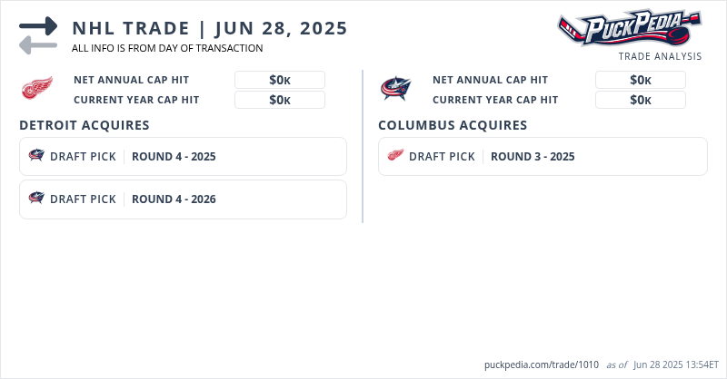 The Columbus Blue Jackets acquired a 2025 3rd round pick (#76) from the Detroit Red Wings for a 2025 4th round pick (#109) anda 2024 4th round pick