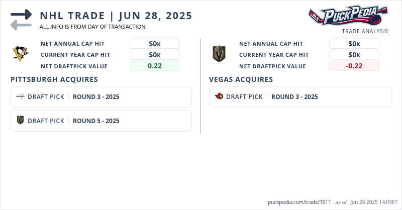 The Vegas Golden Knights acquired a 2025 3rd round pick (#85) from the Pittsburgh Penguins for a 2025 3rd round pick (#91) and a 2025 5th round pick (#154)