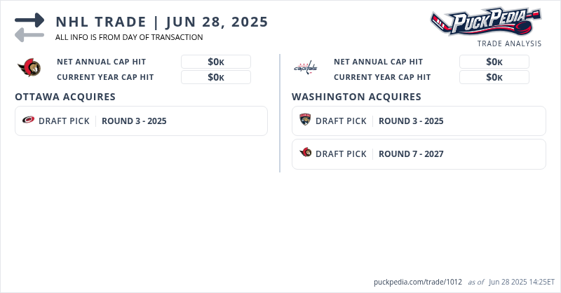 The Ottawa Senators acquired a 2025 3rd round pick (#93) from the Washington Capitals for a 2025 3rd round pick (#96) and a 2027 7th round pick