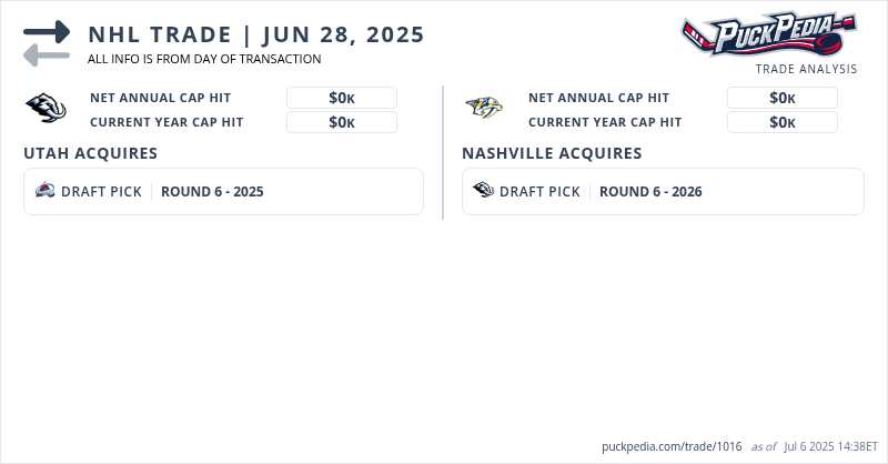 The Utah Mammoth acquired a 2025 6th round pick (#182) from the Nashville Predators for a 2026 6th round pick