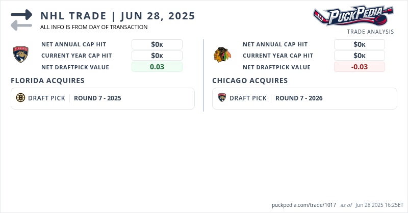 The Florida Panthers acquired a 2025 7th round pick (#197) from the Chicago Blackhawks for a 2026 7th round pick