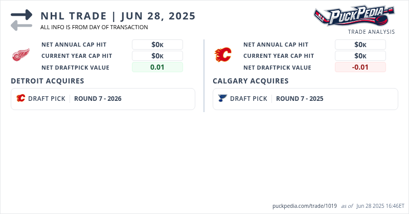The Calgary Flames acquired a 2025 7th round pick (#211) from the Detroit Red Wings for a 2026 7th round pick