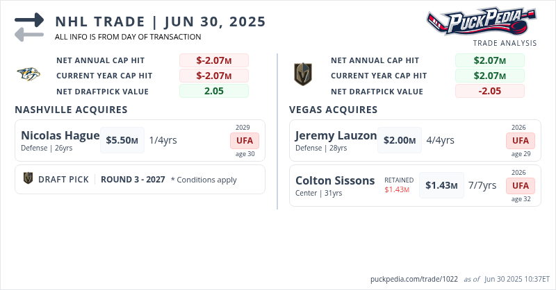The Nashville Predators acquired Nicolas Hague and a conditional 2027 3rd round pick from the Vegas Golden Knights for Colton Sissons and Jeremy Lauzon