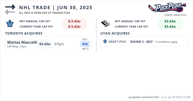 The Toronto Maple Leafs acquired Matias Maccelli from the Utah Mammoth for a conditional 2027 3rd round pick