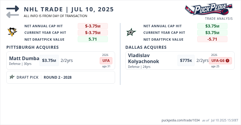 The Pittsburgh Penguins acquired Matt Dumba and a 2028 2nd round pick from the Dallas Stars for Vladislav Kolyachonok