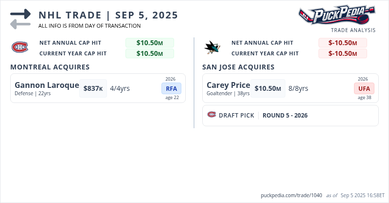 The San Jose Sharks acquired Carey Price and a 2026 5th round pick from the Montreal Canadiens for Gannon Laroque