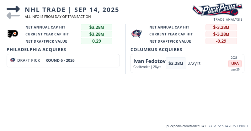 The Columbus Blue Jackets acquired Ivan Fedotov from the Philadelphia Flyers for a 2026 6th round pick