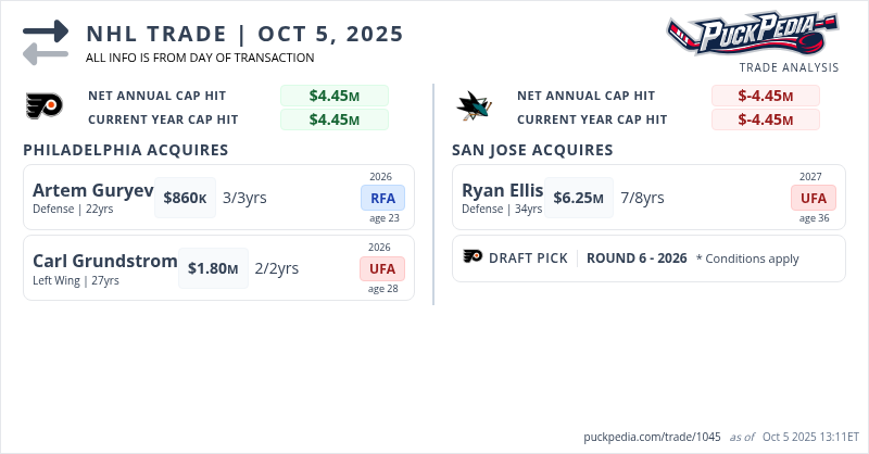 The San Jose Sharks acquired Ryan Ellis and 2026 conditional 6th round pick from the Philadelphia Flyers for Carl Grundstrom and Artem Guryev