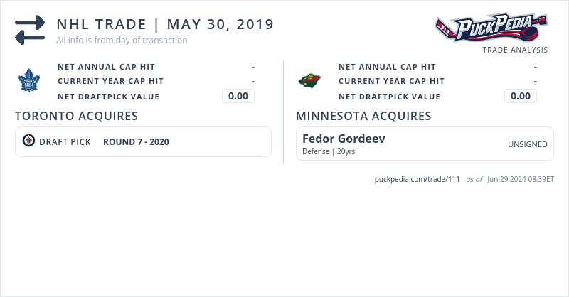 The Maple Leafs acquired a conditional 2020 7th Round Pick from Minnesota Wild for Fedor Gordeev