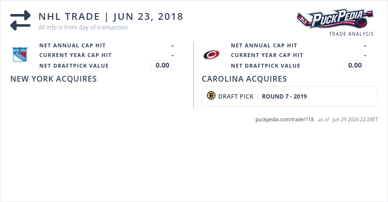 Carolina traded Vegas' 7th-round pick in the 2018 NHL Draft (previously acquired, 216th overall) to NY Rangers for Boston's 7th-round pick in 2019 (previously acquired).