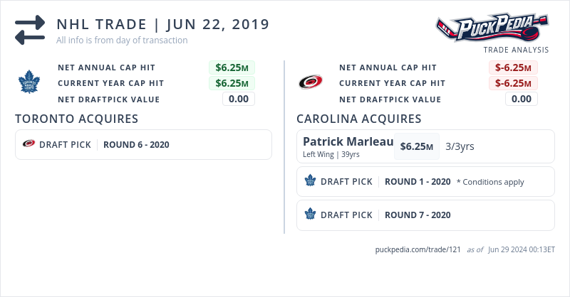 The Carolina Hurricanes acquired Patrick Marleau, a conditional 2020 First Round Pick and a 2020 seventh round pick from the Toronto Maple Leafs for a 2020 sixth round pick