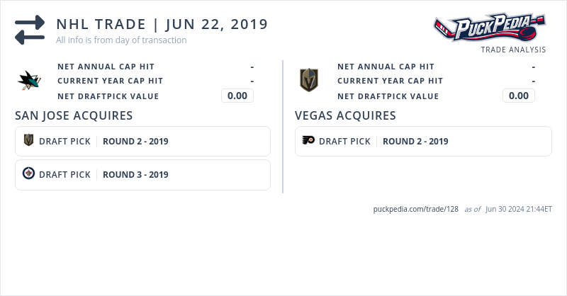 The Vegas Golden Knights acquired 2019 second round pick (#41) from San Jose Sharks for 2019 second round Pick (#48) & 2019 3rd round Pick (#82)