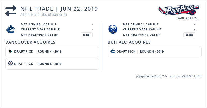 The Buffalo Sabres acquired 2019 fourth round pick (#102) from the Vancouver Canucks for 2019 fourth round pick (#122) and 2019 sixth round pick (#175)