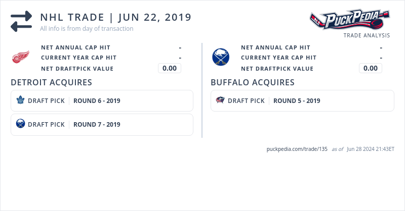 The Buffalo Sabres acquired a 2019 fifth round pick (#143) from Detroit Red Wings for 2019 sixth round pick (#177) & 2019 seventh round pick (#191)