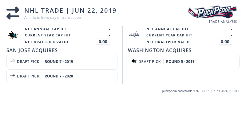 The Washington Capitals acquired a 2019 fifth round pick (#153) from the San Jose Sharks for 2019 seventh round pick (#211) & 2020 seventh round pick