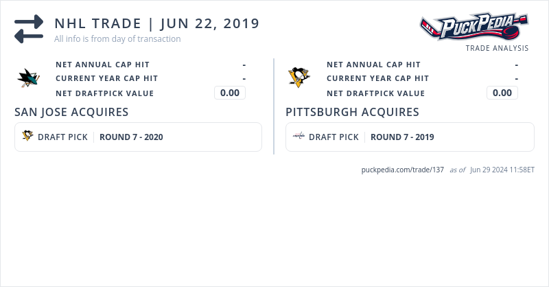 The Pittsburgh Penguins acquired 2019 seventh round pick from San Jose Sharks for 2020 7th Round Pick