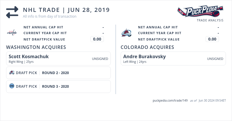 The Colorado Avalanche acquired Andre Burakovsky from Washington Capitals for 2020 second round pick, 2020 third round pick and Scott Kosmachuk