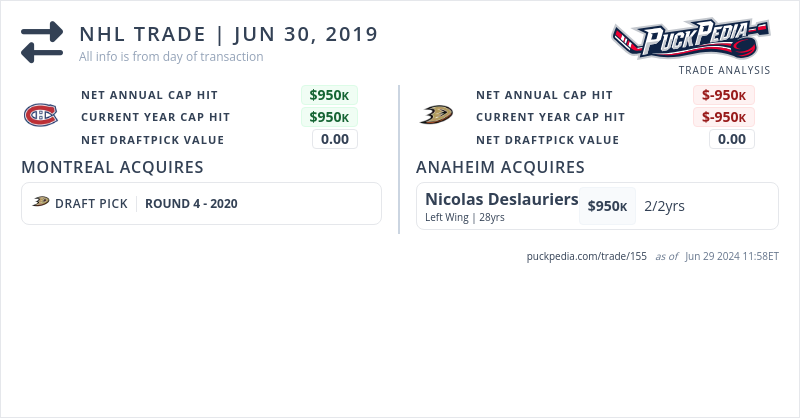 The Anaheim Ducks acquired Nicolas Deslauriers from the Montreal Canadiens for 2020 fourth round pick