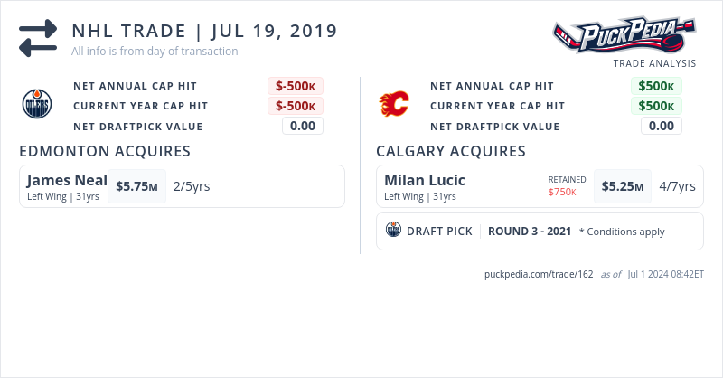 The Edmonton Oilers acquired James Neal from the Calgary Flames for Milan Lucic and a conditional 2020 third round pick