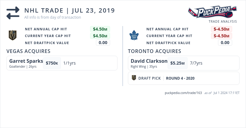 The Vegas Golden Knights acquired Garrett Sparks from the Toronto Maple Leafs for David Clarkson and 2020 fourth round pick