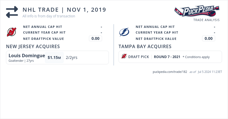 The New Jersey Devils acquired Louis Domingue from Tampa Bay Lightning for a conditional 2021 seventh-round pick