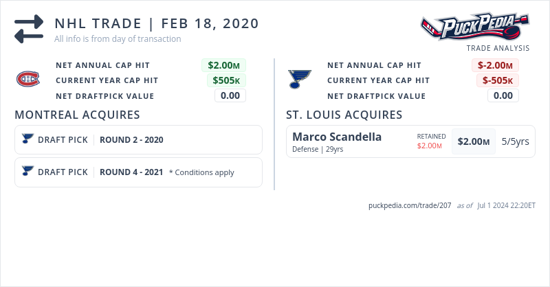 The St Louis Blues acquired Marco Scandella from the Montreal Canadiens for a 2020 second round pick and conditional 2021 fourth round pick