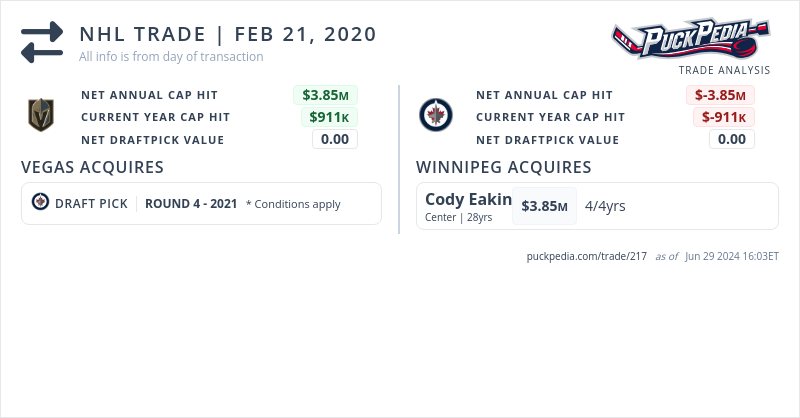 Pick becomes a 2021 3rd Round Pick if Eakins re-signs in Winnipeg or Jets make the 2020 playoffs