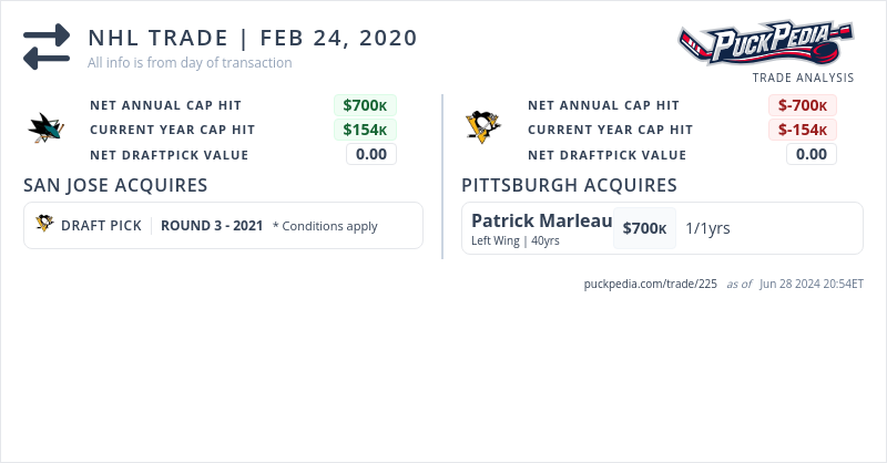 The Pittsburgh Penguins acquired Patrick Marleau from the San Jose Sharks for a 2021 third round pick