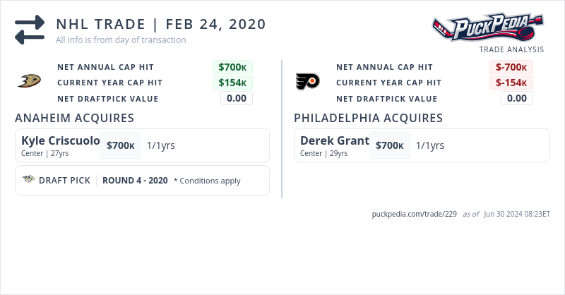 The Philadelphia Flyers acquired Derek Grant from the Anaheim Ducks for Kyle Criscuolo and a 2020 fourth round pick