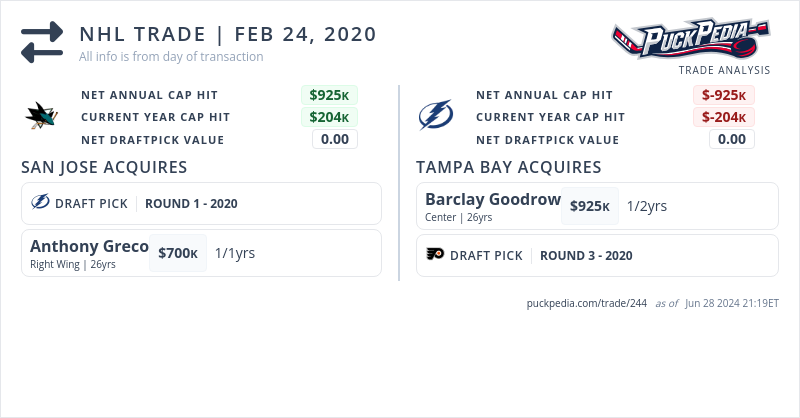 The Tampa Bay Lightning acquired Barclay Goodrow and a 2020 third round pick from the San Jose Sharks for 2020 first round pick and Anthony Greco