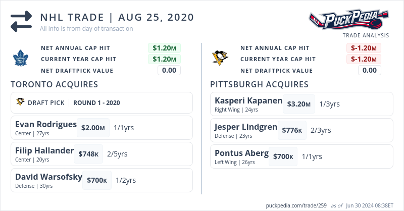 The Pittsburgh Penguins acquired Kasperi Kapanen, Jesper Lindgren, and Pontus Aberg from the Toronto Maple Leafs for Evan Rodrigues, Filip Hallander, David Warsofsky & 2020 1st Round Pick (15th overall)