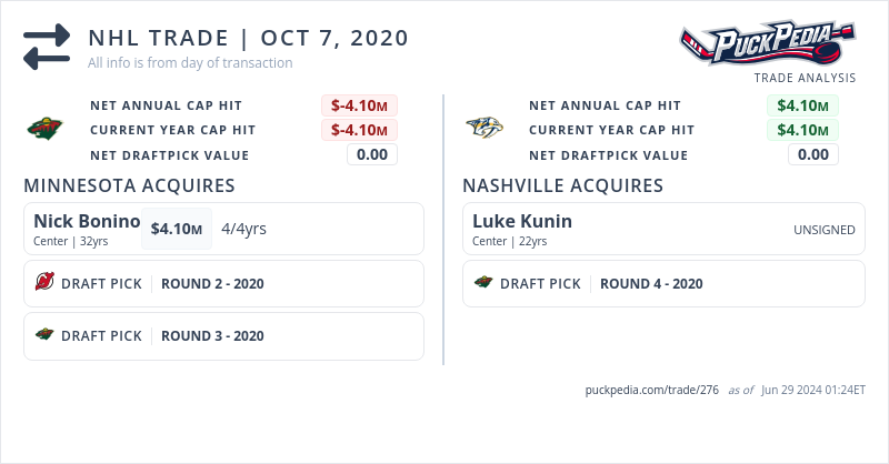 The Nashville Predators acquired Luke Kunin and 2020 fourth round pick (#101) from the Minnesota Wild for Nick Bonino, 2020 second round pick (#37) and 2020 third round pick (#70)