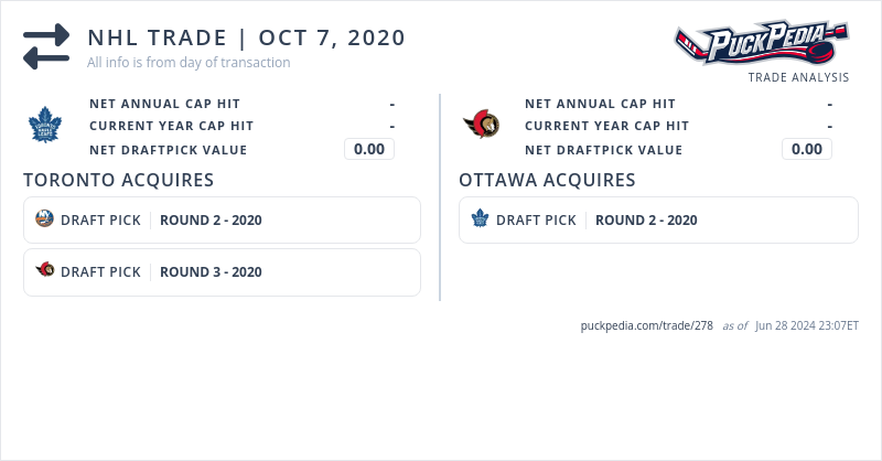 The Ottawa Senators acquired 2020 second round pick (#44) from the Toronto Maple Leafs for 2020 second round pick (#59) and 2020 third round pick (#64)