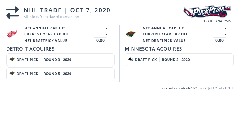 The Minnesota Wild acquired 2020 third round pick (#65) from the Detroit Red Wings for 2020 third round pick (#70) and 2020 fifth round pick (#132)