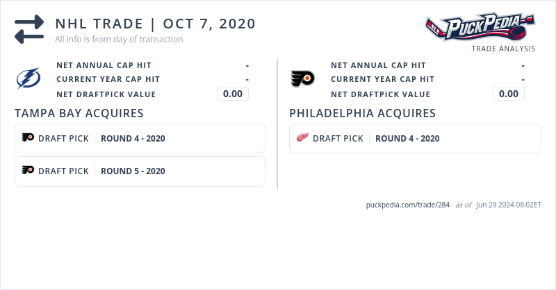 The Tampa Bay Lightning acquired 2020 fourth round pick (#116) and 2020 fifth round pick (#147) from the Philadelphia Flyers for 2020 fourth round pick (#94)